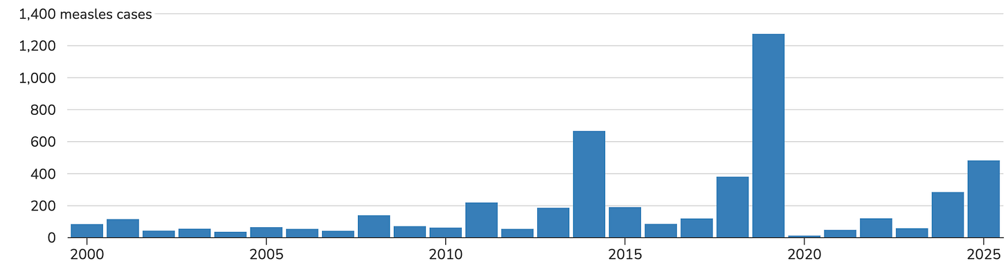 Note: in addition to the relatively small increase in measles this year, unlike Africa, measles deaths are almost unheard of in the United States (e.g., in 2019 a 37-year old man died from measles, and this year, a child with measles died from an erroneously untreated bacterial pneumonia).