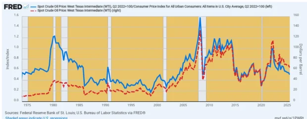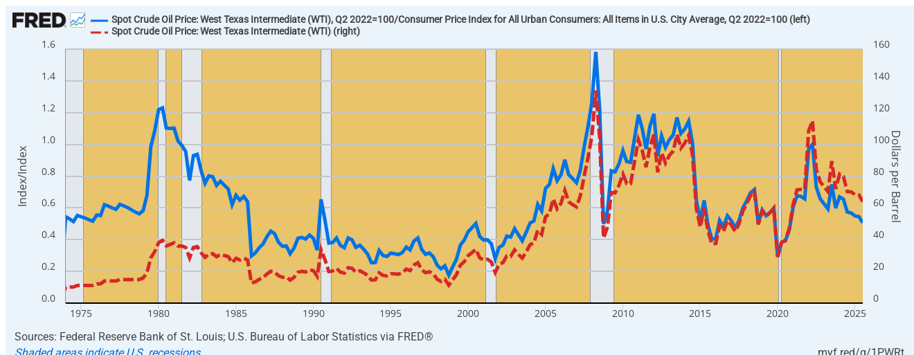 To be sure, there has been a lot of cumulative inflation since the early 1970s. So in the blue line we index the WTI price to the recent Q2 2022 CPI peak of $115 per barrel, which is set at 1.0 on the left hand scale.