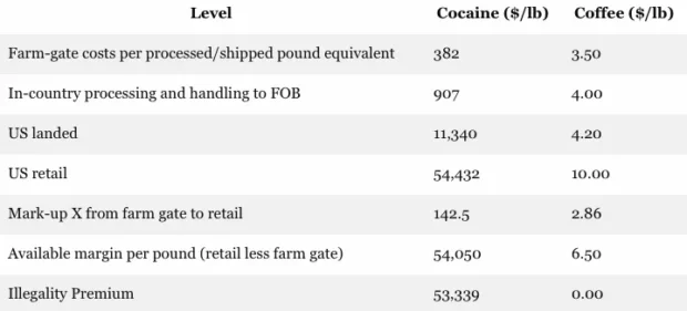 In all, the mark up from the Columbia farm-gate to retail is 142.5X or $54,050 per pound of product distributed at retail. By contrast, coffee beans grown in Columbia and distributed via legal commerce exhibit a mark-up of just 2.86X between farm gate and retail value per pound.