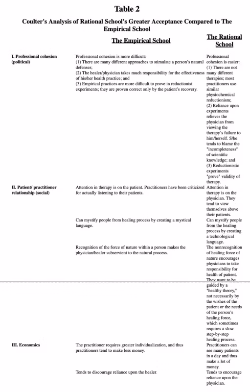 Coulter points out that although the Rationalists explained why their methods worked or didn’t work, their explanations were soon disproven and were replaced by a new set of “facts.” Comparatively, Coulter describes the scientific characteristics of the Empirical school and how and why their observations and their health practices have been utilized for long periods of time. Whether the outcomes have been successful has not been adequately determined statistically; however, the great numbers of people over many centuries who have made use of the various Empirical health practices should encourage clinicians and researchers to look more closely at Empirical perspectives and practices.
